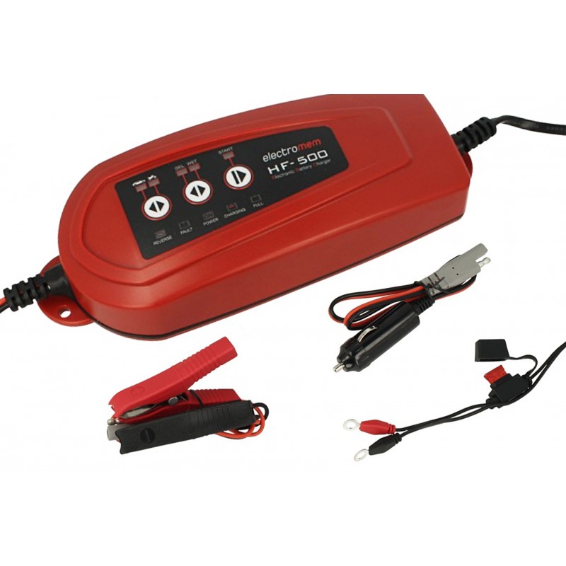 Caricabatterie Electromen Modello HF500 caricare e mantenere in buono stato la batteria di ogni veicolo ad uso privato a 12 Volt: moto, auto, piccole imbarcazioni, trattorini e piccoli mezzi da lavoro. Il microprocessore del HF500 gestisce due diversi cicli di carica per batterie al piombo ad elettrolita libero tipo Wet o trattenuto Dry (Gel, Agm, Mf). Effettua cariche specifiche con due regolazioni di corrente da 1 A o 3,5 A, a seconda della batteria da ricaricare. In mancanza di rete improvvisa HF500 si spegne e al ritorno dell’alimentazione riprenderà la ricarica dall’ultima fase in atto memorizzata dal microprocessore.