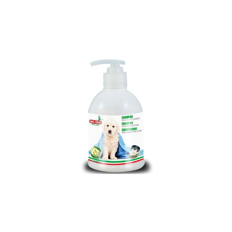 SHAMPOO PER CANI A PELO BIANCO, specifico per cani a pelo bianco, è un detergente appositamente studiato per eliminare l’antiestetico colore giallastro dal pelo del vostro simpatico amico a quattro zampe.